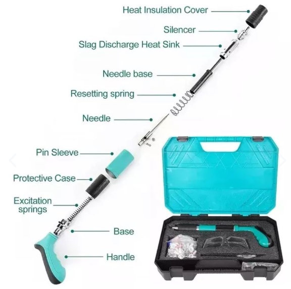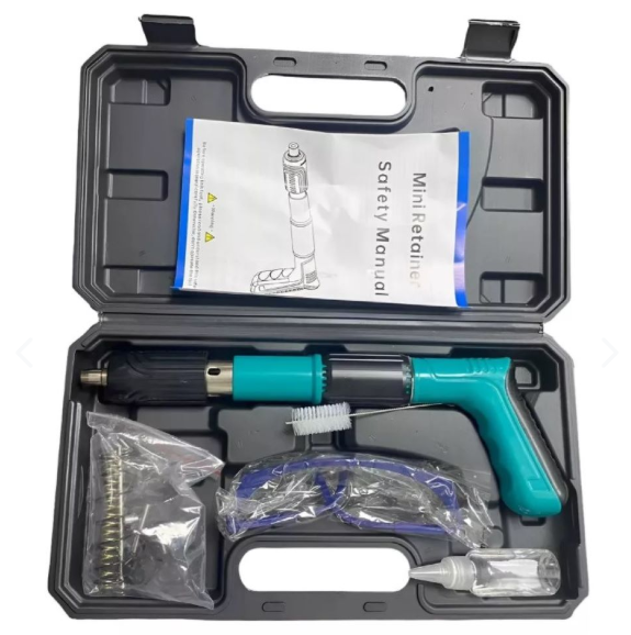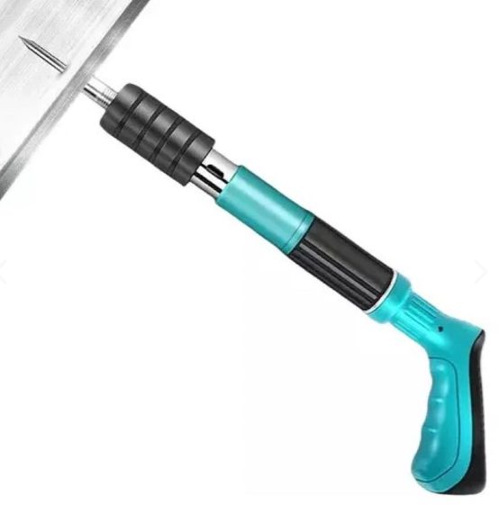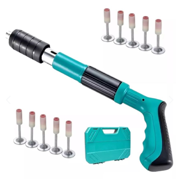 Herramienta de fijación de clavos para pared, etiquetada como “Nail Wall Fastening Tool 5 Gears”. Este dispositivo está diseñado para ser utilizado en diferentes tipos de materiales como se especifica en la caja: