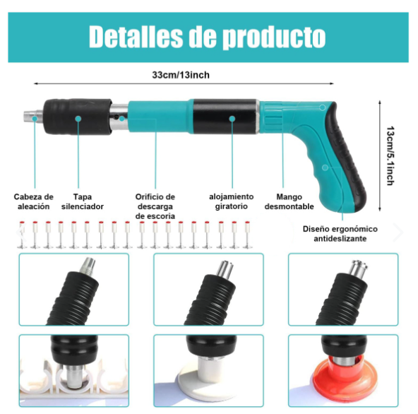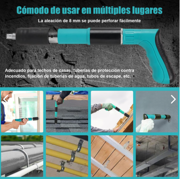Las imágenes en la caja muestran la herramienta en uso, demostrando su capacidad para fijar firmemente clavos y otros elementos de fijación en diversos materiales, lo que la hace ideal para tareas de construcción y mantenimiento en el hogar o en entornos profesionales.